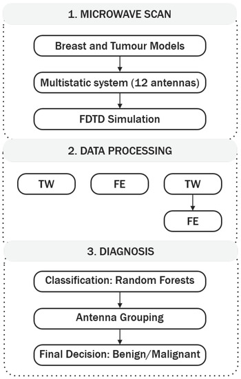 In the remainder of Section 1, the findings from previous studies using machine learning with microwave technology are reviewed in Section 1.2, and the main challenges still to be addressed in diagnosing breast tumours with microwaves are discussed in Section 1.3. The methodology is discussed in Section 2, which proposes a three-stage diagnosis system for addressing some of the primary challenges. The results are listed in Section 3 and Section 4 discusses and concludes the study.