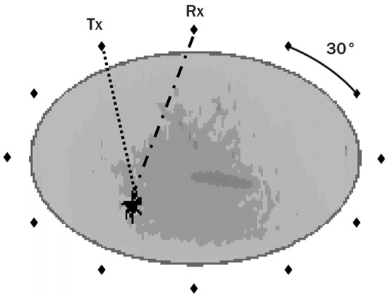 Figure 2 displays a schematic representation of the acquisition setup designed for FDTD simulation in this study, where the antennas are represented by the black diamonds surrounding the breast. A coronal slice of one of the breast models used in the study is shown, including fibroglandular tissue in the interior, and a malignant tumour in one of the lower quadrants (the spiculated shape in black). To aid the visualisation of the setup, the path from one transmitting antenna (Tx) to the tumour and from the tumour to the receiving antenna (Rx) is shown in dash and dot-dash lines, respectively.