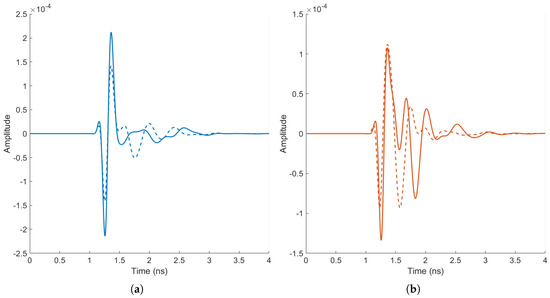 By way of example, Figure 3 displays some of the differences identified by visual analysis of benign (Figure 3a) and malignant signatures (Figure 3b). The signals were collected under ideal conditions to highlight the potential differences between types of tumours, with an adipose-only breast model; for both tumour types, two tumour models were simulated of different sizes and shapes. The resultant signals have been time-aligned and windowed. As observed in Figure 3a, the backscattered signals from the benign tumour models exhibit little distortion and the original Gaussian shape is preserved well; conversely, in Figure 3b, the malignant tumour models result in backscattered signals with a higher level of waveform distortion.
