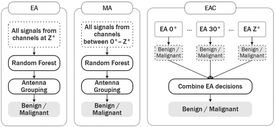 This variance in the tumour signatures between channels may impact the performance of the classification model, as the variance between channels may be as large as the variance between the signatures of benign and malignant tumours. To explore the significance of intra-channel variance, three types of classification models were designed, which differ in the way signals from different channel angles are utilised by the classification algorithm. The three types of classification models are shown in Figure 4. Differences in the performance of the three types of classification models may help identify if an optimal antenna pair topology exists in terms of the channel angle, which can ultimately contribute to improving diagnostic performance.