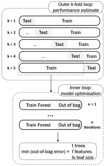 In this study, the authors have implemented a validation methodology based on the idea of nested cross-validation [53] to assess diagnostic performance, and mitigate sources of contamination when optimising the classification model. It has been shown that nested cross-validation helps prevent overly optimistic reports of model performance [52,53]. An overview of the process is shown in Figure 5, and can be summarised as follows: