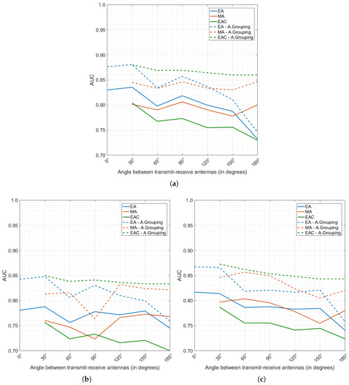 Equal Angle Combined (EAC) models use all possible EA models (one for each channel angle), and the predictions from each one are combined (through majority voting) at the end to produce a final diagnosis. By combining the predictions from each individual model, models which yield an incorrect result are likely to be disregarded, ultimately contributing to an increase in diagnostic performance. As before, a total of six EAC models were built using all antenna pairs in the interval °, with , until all antenna pairs were used. Table 2 summarises the models of each type, in particular the range of angles considered in this study.