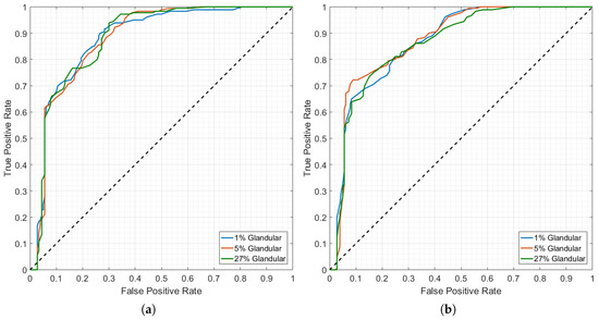In this study, the performance of a classification model is assessed by plotting the Receiver Operating Characteristic (ROC) curves. ROC curves are created by plotting the false positive rate achieved by the classification model in the horizontal axis, against the true positive rate in the vertical axis [64]. ROC curves provide with a simple graphical representation of the diagnostic ability of the classification model, by varying the decision threshold that is used in producing the final binary decision, i.e., whether breast tumours are benign or malignant.