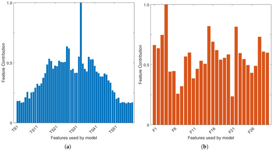 Map of relative feature contribution calculated during the training of the random forest model for the breast model with 27% glandular content by volume. The EAC 0–30°, with all channels in antenna grouping, is used. (a) refers to the dataset pre-processed with TW method; the horizontal axis shows the time samples (TS) which make up the time-domain tumour responses; (b) refers to the dataset pre-processed with the FE method, where F1 to F30 shown in the horizontal axis correspond to Features 1 through 30.