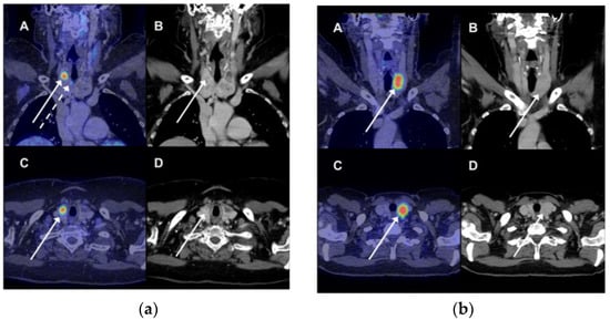 (a) A 69-year woman had a 18F-fluorodeoxyglucose positron emission tomography/computer tomography (FDG PET/CT) scan because of suspected pancreatic cancer (not verified). There was incidental FDG uptake in three lesions in the right thyroid. The patient underwent total thyroidectomy; pathology showed papillary adenocarcinoma in all three PET-avid lesions. (A) Fused coronal PET/CT images showed intense FDG uptake (standardized uptake value, SUV 9.8) in the upper right part of the right thyroid (full white arrow). Another site of pathological FDG uptake was seen on this coronal slice as well (dotted white arrow). (B) The CT image showing a bilateral nodular goiter with an arrow indicating the site of most intense FDG uptake on the fused images. (C + D) Corresponding transverse images of the fused PET/CT images and CT scan with the most intense FDG-avid lesion; (b) An FDG PET/CT was performed in a 69-year woman due to suspicion of ovarian cancer (confirmed). Incidental FDG uptake was seen in the left lobe. A fine needle aspirate showed benign findings (colloid nodule). Any false-negative findings were ruled out during clinical and imaging follow. (A) Fused coronal PET/CT images showed intense FDG uptake (SUV 11.0) in the upper right part of the right thyroid (full white arrow). (B) The CT image showing a bilateral nodular goiter with an arrow indicating the most intense site of pathological FDG uptake on the fused images. (C + D). Corresponding transverse images of the fused PET/CT images and CT scan of the most intense FDG-avid lesion.