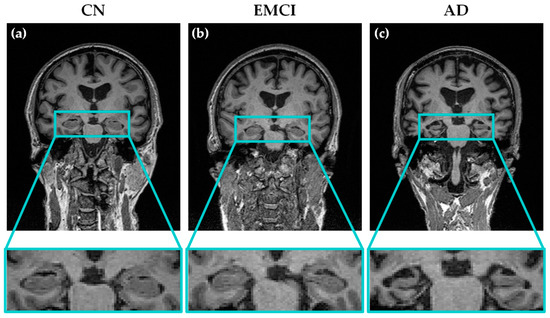 Examples of T1-weighted coronal MRI scans of three different subjects from the three groups of patients considered in this study: (a) cognitive normal (CN); (b) early mild cognitive impairment (EMCI) and (c) Alzheimer’s disease (AD). The progressive atrophy in the hippocampal region through the different stages of the disease can be observed.