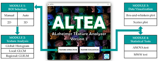 Structure of the software tool ALTEA (ALzheimer TExture Analyzer) designed for the purpose of this study. The tool has two main blocks, “Feature Extraction” and “Feature Evaluation”, and each block has two sub-blocks or modules, as shown in the image.