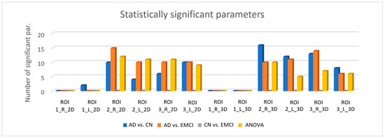 It is important to emphasize that the results showed in Figure 3 and in Table A1 and Table A2 represent the statistically significant features resulting after applying the BH correction. When applying the Bonferroni correction, the number of significant features decreased severely due to its conservative nature: for the six 2D ROIs, 8 and 12 features were significant when differentiating AD from CN and EMCI respectively, and for the six 3D ROIs, 15 and 4 features were significant when differentiating AD from CN and EMCI respectively.