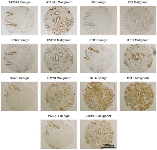 Representative images of a high-risk malignant (HR) and low-risk malignant (LR) prostate cancer tissue core (0.6 mm diameter) taken from sister sections of a tissue array block. Tissue array sections were stained using a 3,3-diaminobenzidine (DAB) protocol for the following proteins (ATP synthase F1 subunit 1 (ATP5A1), Diazepam-binding inhibitor (DBI), 60 kDa Heat Shock Protein (HSP60), IF3EI, Integral Membrane Protein 2B (ITM2B), Myosin Light Chain 6 (MYL6), and Polyadenylate-binding protein 3 (PABPC3)).