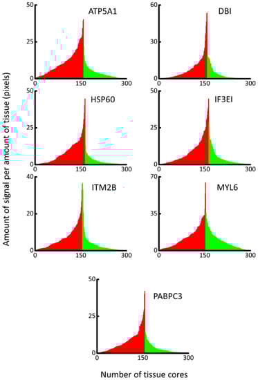 Mountain Plots. The total area of DAB stain and the total quantity of tissue present in each tissue core (pixels) was measured using a high throughput, semi-automated protocol using ImageJ software. Mountain plots illustrating the amount of DAB signal per amount of tissue in each tissue core. Red bars represent HR cores arranged in ascending order and green bars are LR tissue cores arranged in descending order. Plots were constructed in Origin (OriginLab, Northampton, MA, USA) software. Significant differences between protein expression in HR and LR tissue cores were observed in all proteins tested: ATP5A1 (p < 0.001), DBI (p < 0.001), HSP60 (p < 0.001), IF3EI (p < 0.001), ITM2B (p < 0.001), MYL6 (p = 0.0012), and PABPC3 (p < 0.001).