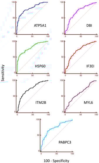 Changes in expression have been illustrated in mountain plots (Figure 2), where clear differences in expression can be seen between HR tissue cores (red) and LR tissue cores (green). A Mann–Whitney-U test revealed statistically significant differences between HR and LR tissue core expression for ATP5A1 (p < 0.001), DBI (p < 0.001), HSP60 (p < 0.001), IF3EI (p < 0.001), ITM2B (p < 0.001), MYL6 (p = 0.0012), and PABPC3 (p < 0.001). Comparing each of the tested proteins for their predictive ability to distinguish between HR and LR tissue cores (Table 3) revealed that ATP5A1 had the highest sensitivity (71.43) and specificity (78.05). ROC curve analysis was carried out to characterise the potential clinical utility of these proteins as biomarkers of malignancy in PCa specimens (Figure 3, Supplementary Table S1). The positive post-test probability ranged from 0.67 to 1.82% (LR+ = 1.463–3.950) and the negative post-test probability ranged between 0.12–0.31% (LR− = 0.2630–0.678). The area under the curve (AUC) of the ROC curve was highest in ATP5A1 (0.806 ± 0.026) and lowest in MYL6 (0.61 ± 0.034) with all other biomarkers demonstrating a range of AUC between these two values. The AUC indicates a greater likelihood of being able to distinguish between disease than other proteins tested, and a higher AUC would generally make a protein a better candidate for putative biomarker. A logistic regression model, performed using MedCalc software, shows an increase in diagnostic performance can be achieved by incorporating data from both ATP5A1 and HSP60. The use of both sets of data resulted in 71.85% of cases being correctly classified (AUC = 0.822 ± 0.025, data not shown in Table 3).