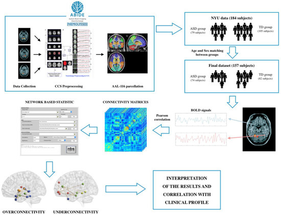 Figure 1. Framework of the study design. Firstly, fMRI images were obtained from ABIDE database (http://fcon_1000.projects.nitrc.org/indi/abide/). Then, ASD and TD groups were age and sex-matched, and functional brain networks were obtained using Pearson’s correlation coefficient between BOLD signals of every pair of brain regions. Using the toolbox “Network Based Statistic Toolbox” for Matlab, these networks were analyzed.