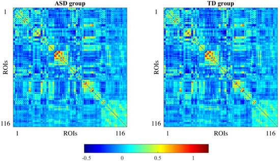 Figure 2. Mean connectivity matrices for ASD and TD groups. Connectivity is obtained using Pearson’s correlation coefficient normalized to Fisher’s z-values. Color scale represents the strength of functional interactions between pairs of ROIs.