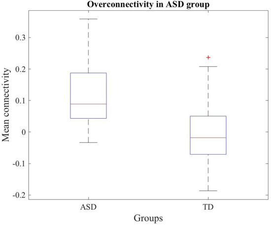 First, we tested the hypothesis of overconnectivity in ASD, and a network with significantly increased connectivity in the ASD group was observed. Figure 3 shows a Box and Whiskers diagram that represents the connectivity of the network for ASD and TD groups.