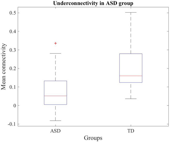 When testing the hypothesis of underconnectivity in ASD, a network that shows decreased connectivity in ASD subjects in comparison to TD subjects was observed. Figure 5 shows a Box and Whiskers diagram that represents the connectivity of the network for ASD and TD groups.