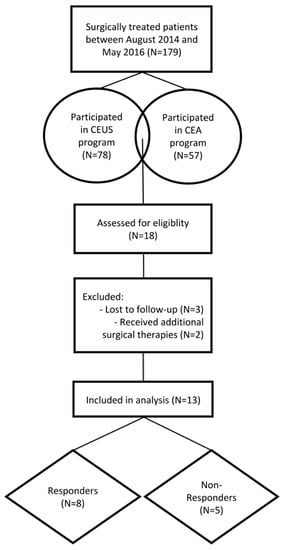 This study was designed as a prospective clinical observer study. Between August 2014 and May 2016, 179 patients received surgical treatment of non-unions based on the “diamond concept” in our department. Out of these 179 patients, 78 patients participated in the perioperative CEUS program and 57 patients participated in the peripheral CEA program. A total of 18 patients agreed to participate in both programs. According to the inclusion and exclusion criteria, 13 (Responders in group 1 (G1), N = 8 and Non-Responders in group 2 (G2), N = 5) patients were included in the current study. The study was conducted in accordance with the declaration of Helsinki in its current form. Furthermore, inclusion of patients started subsequent to the approval by the local ethical committee (S-636/2011 (day of approval 16 July 2012) and S-033/2014 (day of approval 4 July 2014) (Figure 1).