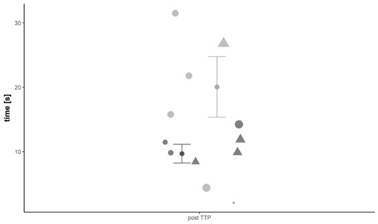 Visualization of results from CEUS analysis. In particular, results from the analysis of the parameter time to peak (TTP) 12 weeks subsequent to the second step are shown and compared between groups. Dark points with whiskers display mean time in Responders, grey points with whiskers indicate mean time in Non-Responders (whiskers are the standard error of the mean (SEM). Results are further stratified to age and sex and values for each participating patient are given. Here, triangle indicates male sex and dots female sex, size of symbol increases with age of patient.