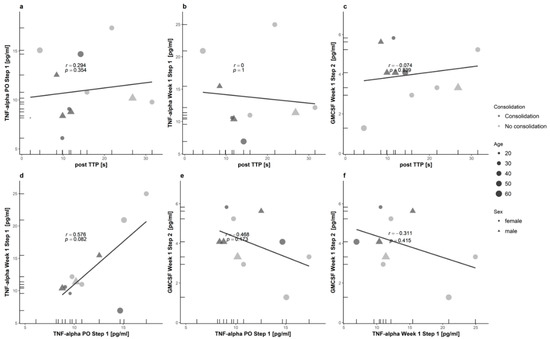 Correlation of the variables of interest (VOIs). Here, correlations between CEUS and CEA parameters are depicted in panel (a–c) and correlations between CEA parameters in panel (d–f) (postTTP vs. TNF.α.PO.Step.1 (a), vs. TNF.α.Week.1.Step.1 (b) and vs. GM.CSF.Week.1.Step.2 (c)//TNF.α.PO.Step.1 vs. TNF.α.Week.1.Step.1 (d) and vs. GM.CSF.Week.1.Step.2 (e)//TNF.α.Week.1.Step.1 vs. GM.CSF.Week.1.Step.2 (f)). Covariates are displayed via size (age) and shape (sex) of each data point. The color indicates the criterion (presence or absence of consolidation).