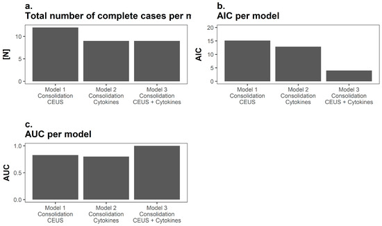 Logistic regression modelling revealed the highest predictive power regarding consolidation subsequent to the non-union treatment for parameters generated by using both CEUS (TTP 3 months after surgery) and serum CEA (GM-CSF values 1 week after the second surgery, TNF-α values both prior to the initial surgery and 1 week after the initial surgery). Thus, model selection was performed using the models AIC and AUC of the corresponding ROC analysis. Only complete cases without a single missing value were integrated in the prediction modelling process; therefore, the number of complete cases was lower once serum cytokine parameters were included due to single missing values (Figure 6a). It is noteworthy that, despite the number of completed cases being lower in the models including serum cytokine parameters, AUC was the highest and AIC the lowest for models including both CEUS and cytokine parameters (Figure 6b,c).
