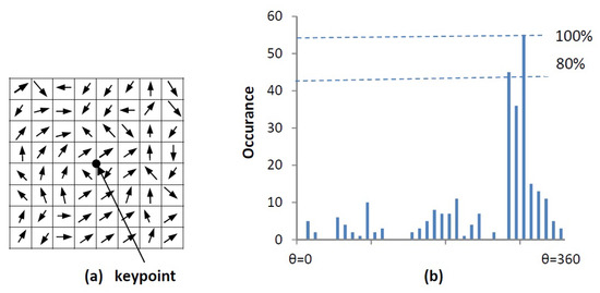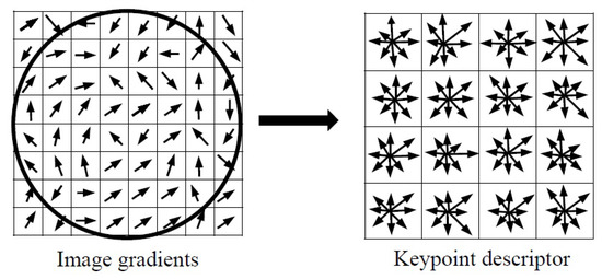 In this stage, a SIFT descriptor is calculated for each keypoint as a histogram of orientation in eight directions (as shown in Figure 8). According to [15,18,19], it is common that a 16 × 16 neighborhood region around each keypoint is divided into 4 × 4 sub-regions. The gradient vectors are aggregated into 8-bin histogram over the matrix of subregions. Then, SIFT extracts element feature vector for each keypoint.