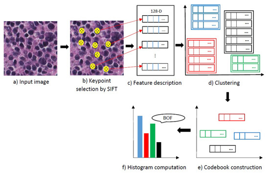 The SIFT-descriptor extracts a feature vector with 128 elements for each keypoint. Using all of the extracted features in the classification of neuroblastoma histological images is time-consuming and have a high computational complexity. So, we use a bag of features [21] as a feature encoding to compute more discriminative representations. The scheme of the bag of features is shown in Figure 9. It starts by selecting keypoints, step (b), and then describes keypoints from the input image step (c). In the next step (d), the extracted features are clustered and the codebook which consists of the codewords is constructed in step (e), codewords are the extracted features by SIFT. Then, a bag of features histogram counts the occurrences of each feature in step (f).