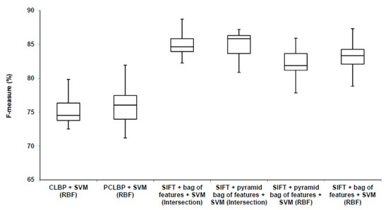 To evaluate the proposed method, we use the remaining 80% of the dataset which is not seen in the experimental setup. They are divided randomly into the training set (623 images) and testing set (209 images). We train the final model using the training set and test it using the testing set. We repeat this procedure multiple times (10 times) and report the average accuracy. We use the standard bag of features and the pyramid bag of features [21] algorithms to evaluate the proposed method. In each case, we used RBF kernel type and histogram intersection kernel [23]. We measured the performance of our algorithm by the weighted average (weighted by the number of samples in each class) F-measure, recall and precision. The results are shown in Table 6. We compared our method with Patched Completed Local Binary Pattern (PCLBP) and Completed Local Binary Pattern (CLBP) as benchmarks. Distribution of the computed F-measures for different approaches over the ten trials is presented in Figure 10. It shows that combination of SIFT with the bag of feature works better than CLBP and PCLBP.