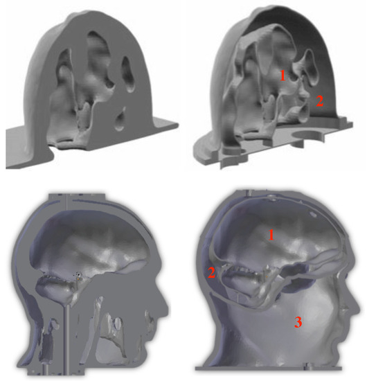 As for the head structure, it includes three fixed cavities. Cavities 1 and 2 (Figure 1—down right) are filled up from the top with brain and cerebrospinal fluid (CSF) TMMs, respectively, and cavity 3 can be filled from the bottom of the structure with mixtures whose dielectric properties can be adjusted in order to fit those of various tissues, such as bone, muscle, blood or a medium whose properties are an average of that of these tissues. Of course, the latter cavity must filled up before the former ones with the head upside down and the filling hole must be tightly closed before turning the phantom right side up. It can be noted that during this operation, it is difficult to avoid a little bit of air remaining in the cavity; however, once the phantom is right side up, this air will rise to the level of the nasal cavity where it is naturally present in a real human head.