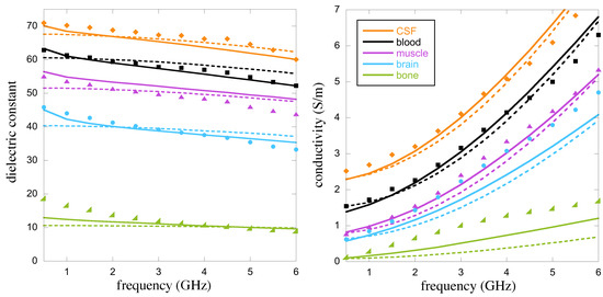 Figure 4 displays the results obtained over the 0.5–6 GHz band. Measured, predicted (from Böttcher’s model) and expected (from the Cole–Cole model) properties are in good agreement for almost all the tissues except, maybe, the measured values of conductivity for the brain and the bones that deviate a little bit from the expected values. It is worth noting that the variability of human tissue dielectric properties is very important. In the frequency band considered herein, it is evaluated in Reference [1] to be in the range (where ) of the permittivity values given by the Cole–Cole models. Concerning the breast tissues considered in Table 1, the variability is even more important as each group spans tissues with a large heterogeneity in their adipose content (see [2]—Figures 9 and 10). This means that for almost all the TMMs considered herein except the bone mimicking one, the measured values fall within the uncertainty range of the Debye and Cole–Cole models, if the variability ranges of the tissue dielectric properties can be considered as the uncertainty ranges of the parametric models.