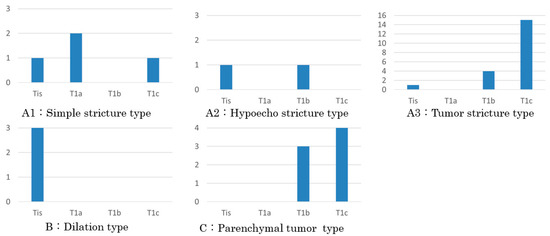 T category of the lesions. Categories (A1) and (A2) without an obvious tumor include carcinoma in situ (CIS) and invasive carcinoma. Two of the three invasive carcinomas of A1 were T1a. (A3) and (C) with a detectable tumor almost consist of T1b and T1c. Every carcinoma of (B) showing pancreatic duct dilation without a downstream stricture is CIS.