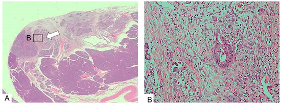 C: Parenchymal tumor type. Seven patients were included. In three patients, carcinoma was located in the head, and in another three, it was located in the body. In the remaining patients, it was located in the tail. Three and four carcinomas were classified into pT1b and pT1c, respectively. All carcinomas were invasive with abundant fibrous stroma (Figure 9). Tumors were distant from the MPD, while, in three patients, dysplastic epithelium continued to the MPD, on the branch duct.
