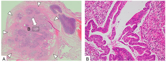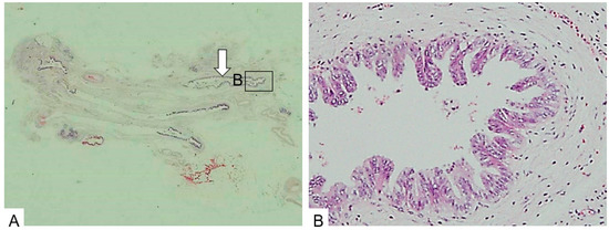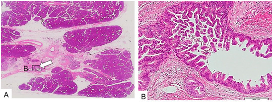 Dilation type. (A). The pancreatic parenchyma is severely atrophic and replaced by fat. Ducts are dilated (arrow). (B). The ductal epithelium shows CIS. (H.E., ×100). Copyright information © Japan Pancreas Society 2015 [11].