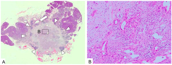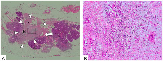 Parenchymal tumor type. (A). A tumor with an irregular margin is recognized (arrow heads) without invading the main pancreatic duct (arrow). The main pancreatic duct has a fibrously thickened wall, which is in contact with the tumor, but has not been invaded. (B). The tumor consists of dense fibrous stroma with cancer pseudoglands. (H.E., ×100).