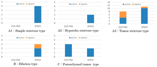 Among the 27 patients in the A3 (20) and C (7) categories with a recognized tumor, 11 and 13 underwent EUS-FNA and SPACE for preoperative diagnosis for PC, with positive results in seven (63.6%) and 12 (92.3%), respectively (Figure 10). Three among the four patients with a negative result by EUS-FNA, belonging to A3 (including a case of CIS with so-called mass forming pancreatitis), alternatively underwent SPACE with a positive result for PC. One patient with a negative result by SPACE, belonging to A3, alternatively underwent EUS-FNA with a positive result for PC. Four patients, including three without selecting preoperative diagnostic procedures and one with a negative result for PC by EUS-FNA underwent surgical treatment without preoperative confirmative diagnosis for PC.