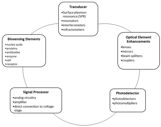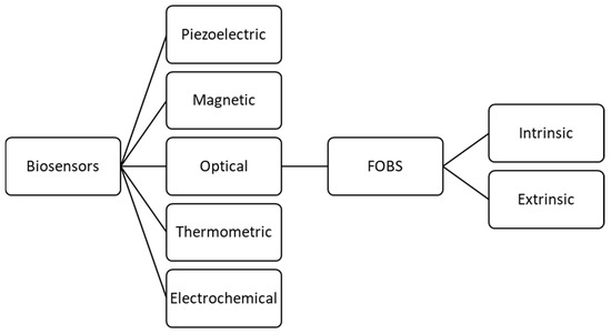 Biosensors can be broken down into several categories, first by transducer mechanism, and then by components, as presented in Figure 1. FOBS are differentiated from other biosensors by the optical-based transducer that uses absorbance, reflectance, luminescence, refractive index, and light scattering to alter the signal for processing [8].