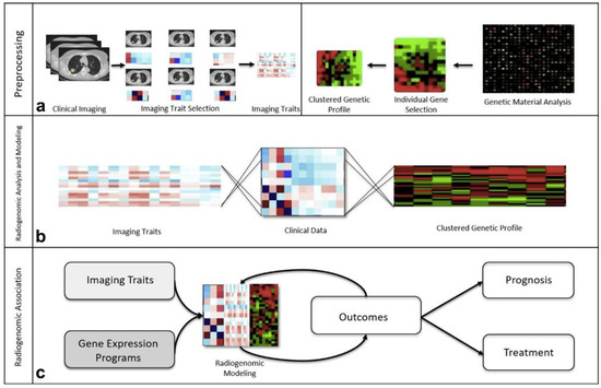 Figure 1. Diagram of the radiogenomic process. (a) First, imaging traits or “radiographic phenotypes”, such as tumor shape, intensity, margins, and texture, are extracted from segmented images. Genomic maps indicating the expression of individual genes or gene clusters are created from the given tissue specimen. Then, the imaging traits, genomic maps, and other clinical data, including histopathologic information or tumor marker data, are statistically analyzed and aggregated to form a radiogenomic association map. (b) The radiogenomic model is used to gain clinical data, including prognostic and predictive information, for a given set of imaging features and genomic information. (c) Incorporation of outcomes data into the radiogenomic model leads to further refinement and model validation. Reproduced with permission from [4], published by Elsevier, 2018.