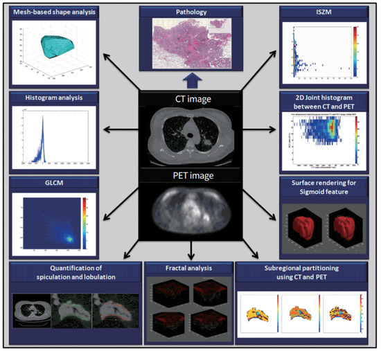 Figure 2. Examples of various radiomics features that can be extracted from CT and positron emission tomography (PET) images. Gray-level co-occurrence matrix (GLCM), histogram analysis, mesh-based shape, intensity size zone matrix (ISZM), two-dimensional joint histogram, surface rendering for sigmoid features, and sub-regional portioning are various features than can be extracted from CT and PET images. These features can then be correlated with clinicopathologic data to gain prognostic and predictive information. Reproduced under a CC-BY-NC 4.0 license from [19].