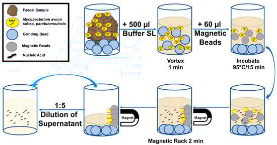 The Mycobacterium avium subspecies paratuberculosis (MAP) as the causing agent for Johne’s Disease (Paratuberculosis) in ruminants is a Gram-positive, aerobic, non-motile, non-spore-forming and acid fast bacterium [1]. Clinical signs of John’s disease, such as weight loss, reduction in milk production and progressing diarrhoea, have an enormous negative impact on the dairy industry [2]. Transmission occurs mainly through the faecal–oral route [3]. The identification of subclinical shedders is highly necessary to prevent silent spreading of the pathogen within the herd. Faecal culture is the gold standard for the diagnosis of MAP [4], however it requires at least 12–16 weeks before the sample can be considered as negative. Alternatively, highly sensitive and specific molecular assays such as Polymerase Chain Reaction (PCR) [5] or the recently published Recombinase Polymerase Amplification assay for the detection of MAP (MAP RPA) [6] are available. However, the clinical performance of these assays depends strongly on the quality of the extracted DNA [7]. Isolation of MAP DNA from faecal samples is especially challenging due to the presence of other complex compounds in the bovine faeces, which can inhibit the amplification process. Moreover, the cell walls of MAP, containing high numbers of lipophilic molecules and polysaccharides, are not easy to destroy [8,9,10]. In standard laboratory protocols, physical disruption is applied after adding chaotropic salts and proteinases to the sample. A lab tube containing silica gel membrane columns is used to obtain a highly purified DNA after employing several washing and centrifugation steps [7,11,12]. These procedures are often time consuming, complex and must be conducted at a well-equipped laboratory. In order to provide a diagnostic tool for paratuberculosis at point of need, here we described a rapid extraction protocol (MAP DNA SpeedXtract) based on magnetic bead. The destruction of the MAP cell wall in the SpeedXtract depends on the combination of physical disruption and heat in the presence of a lysis buffer. The magnetic beads capture the cell debris and most contaminants and then leave the nucleic acid free in the supernatant [13,14,15]. Therefore, the SpeedXtract was named a reverse purification method.