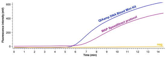RPA results of DNA extracted either by using the QIAamp DNA Mini Blood Kit (blue) and the MAP SpeedXtract protocol (purple). Neg is negative.