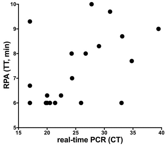 Each of the 45 faecal samples were mixed well and divided into two parts (100 mg each). DNA was extracted from the first portion with the QIAamp DNA Blood Mini Kit and MAP DNA was detected with real-time PCR, while for the other portion, SpeedXtract and MAP RPA were applied. Comparing the results of both protocols revealed that 23/45 tested samples were negative by both methods. Twenty-two samples tested positive in the real-time PCR, while 20 were positive in the MAP RPA assay. No correlation between the threshold time of the RPA and cycle threshold of the real-time PCR was found (Figure 3).