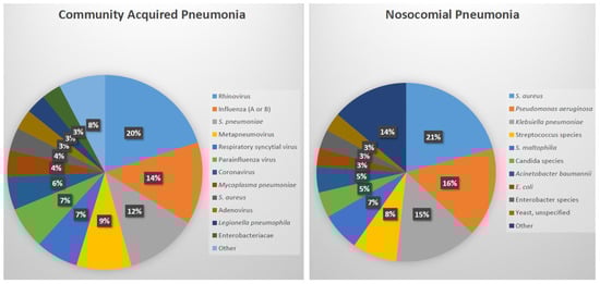 Identified pathogens in community acquired pneumonia (n = 966 pathogens in 853 adults) and nosocomial pneumonia (n = 87) [6,10].