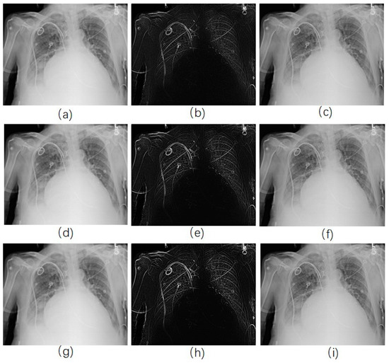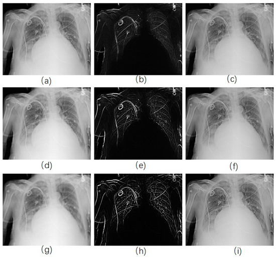 CXR enhancement by use of traditional USM model. (a,d,g) were the smoothed images by use of , , Gaussian kernel, respectively; (b,e,h) were the corresponding Unsharp masks to (a,d,g); (c,f,i) were the corresponding enhanced images.