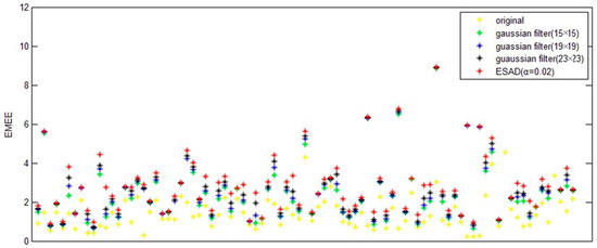 the EMEE value for the original images, results of our method and USM model, respectively, the kernel sizes of Gaussian filter are 15 × 15, 19 × 19, 23 × 23.