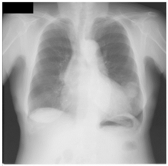 In the RAD-based USM method, the parameter dramatically influences the result. Several different values for this parameter were set so that we can analyze the effect of this term according to various parameters. Firstly, we started with a very small value of 0.001. As we can see in Figure 5a–c (EMEE = 0.587), the result was not desirable since there was the presence of noise. In addition, it did not show a clear contour. As we magnified the parameter , the result was improved. As approached approximately 0.02, the EMEE value of the result was 1.24 (Figure 5d–f), which was greater than that for the traditional method. The noise was less than that shown in Figure 4 and the contour was clearer. When the parameter became bigger, for example, 0.2 (Figure 5g–i), the EMEE value was 1.43, which was greater than the EMEE value for equal to 0.02. More structural information was enhanced in the unsharp mask (Figure 5h). Indeed, we have observed that the contours became thicker. The edge of the ribs became wider which was a good outcome. It was also noticed that less noise was presented in the unsharp mask. The reason for this phonomenon is that the diffusion is too strong. We set with 0.02 and applied our RAD-based USM method for each CXR in the portable CXRs database. Then, we calculated EMEE values for every CXR. To facilitate a comparison, we also calculated the EMEE values for every CXR by using the traditional USM method for the portable CXRs database. Figure 6 shows that the RAD-based USM method usually has a larger EMEE value than that the Gaussian filter-based USM method has. Objective and subjective evaluation methods show that the proposed method is acceptable.