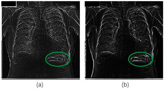 When, we applied our RAD-based USM method to this image from the JSRT database, the diffusion parameter α was set to 0.02. Most of the important edge information was reinforced in the unsharp mask with less noise (as shown in Figure 8b).