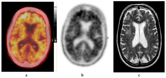 Abnormal study. Seventy-four year old male patient with a history of short term memory problems/gradual memory decline for some time and a query of dementing pathology. (a) and (b) [18F]FBP shows loss of contrast between grey and white matter in all sections of the brain. The scan is suggestive of beta-amyloid plaque deposition and in a patient with the above clinical presentation is suggestive of early AD. (c) MRI brain scan (multiplanar and multi sequence acquisitions) with some motion artefact shows generalised age appropriate cerebral atrophy, proportionate symmetrical temporal lobe atrophy, and corresponding dilatation of the cerebrospinal fluid (CSF) spaces. Moderate to marked periventricular T2 white matter hyperintensities likely to represent chronic small vessel ischemic changes. No diffusion restriction or space occupying lesions were identified. (Figures are courtesy RLBUHT Hospital database.).