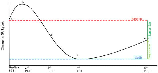 The graph is a theoretic illustration showing the curve for the continuous variable of SULpeak in a fictive patient that corresponds to the patient course illustrated in Figure 2, where (a) to (e) now represent corresponding fictive SULpeak values. The bone lesion in (e) is considered suspect for metastasis. The patient would be categorized to have partial metabolic regression, when compared to baseline (a) as suggested by PERCIST 1.0, but progressive metabolic disease would be concluded when compared to nadir (d). which may be more clinically relevant. SULpeak= peak standardized uptake value normalized to lean body mass.