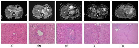 Magnetic resonance imaging (apparent diffusion coefficient (ADC) map, upper row) and histologic findings (H&E stain, lower row) matched for each stages of liver fibrosis. (a) No liver fibrosis (F0), magnification ×400. ADCliver was 1.389 × 10−3 mm2/s and nADCliver was 1.977. (b) Portal fibrosis (F1), magnification ×400. ADCliver was 1.091 × 10−3 mm2/s and nADCliver was 1.327. (c) Periportal fibrosis (F2), magnification ×400. ADCliver was 1.376 × 10−3 mm2/s and nADCliver was 1.416. (d) Septal fibrosis (F3), magnification ×200. ADCliver was 0.963 × 10−3 mm2/s and nADCliver was 1.29. (e) Cirrhosis (F4), magnification ×20. ADCliver was 1.278 × 10−3 mm2/s and nADCliver was 1.355.