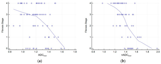 In this study, we observed moderate negative correlations between nADCliver and both TE values and fibrosis stage (r = −0.523 and −0.584, respectively). ADCliver was negatively correlated with both TE values and fibrosis stage as well, although it was only weakly correlated with both (r = −0.256 and −0.281, respectively). Based on the results of AUC, the diagnostic performance of nADCliver was superior to ADCliver, with significant differences in fibrosis staging results for ≥F2 (p = 0.031) and ≥F4 (p = 0.041). nADCliver demonstrated good diagnostic performance in diagnosing all stages of fibrosis in comparison to TE (p > 0.05, no significant differences between the parameters).