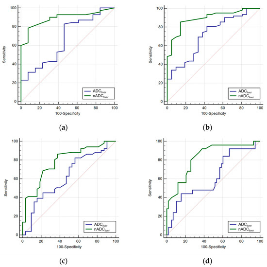 Comparison of receiver operating characteristics curve for diagnosing fibrosis stage ≥F1 (a), ≥F2 (b), ≥F3 (c), and F4 (d) on liver ADC (ADCliver) and normalized ADC (nADCliver).