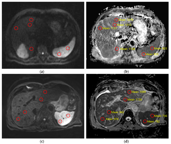 - Song, J.S.; Kwak, H.S.; Byon, J.H.; Jin, G.Y. Diffusion-weighted MR imaging of upper abdominal organs at different time points: Apparent diffusion coefficient normalization using a reference organ. J. Magn. Reson. Imaging 2017, 45, 1494–1501. [Google Scholar] [CrossRef] [PubMed]